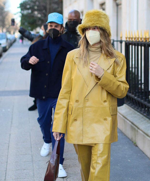 Меховая панама + кожаный костюм: Хейли Бибер показывает, как надо встречать весну